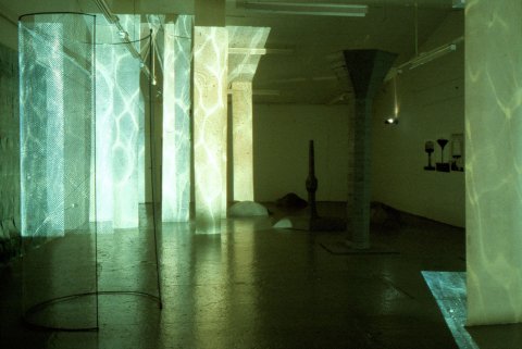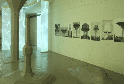 Installation; diasprojektion, fotokopi, tonet s/h fotografi, 40 x60 cm, gipsskulptur.
