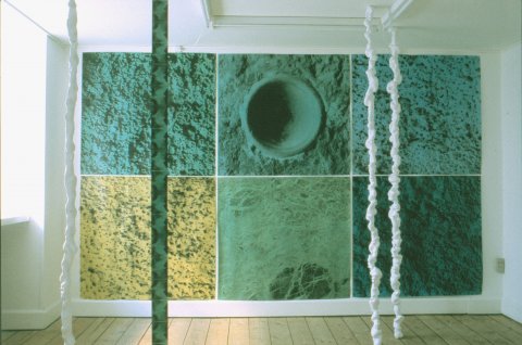 Installation; gips, fotokopi, ståltråd og tonet s/h fotografi, 103 x114 cm.